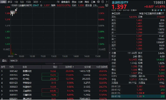 热门ETF方面,金融科技ETF(159851)延续涨势,现场内涨超2%,冲击日线四连阳,实时成交额超1.5亿元,环比放量明显!