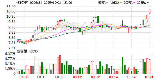 交易行情显示,10月21日—10月24日这4个交易日内,*ST荣控累计斩获三个涨停板。截至10月24日收盘,公司股价收于涨停价11元/股,总市值16.15亿元。