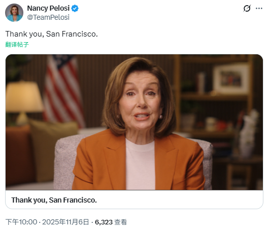 佩洛西在社交媒体上发布了一段篇幅较长、情感真挚的视频,向旧金山民众传达消息:“我将不再寻求连任国会议员。怀着感恩之心,我期待以你们自豪的代表身份,完成最后一年的服务。”