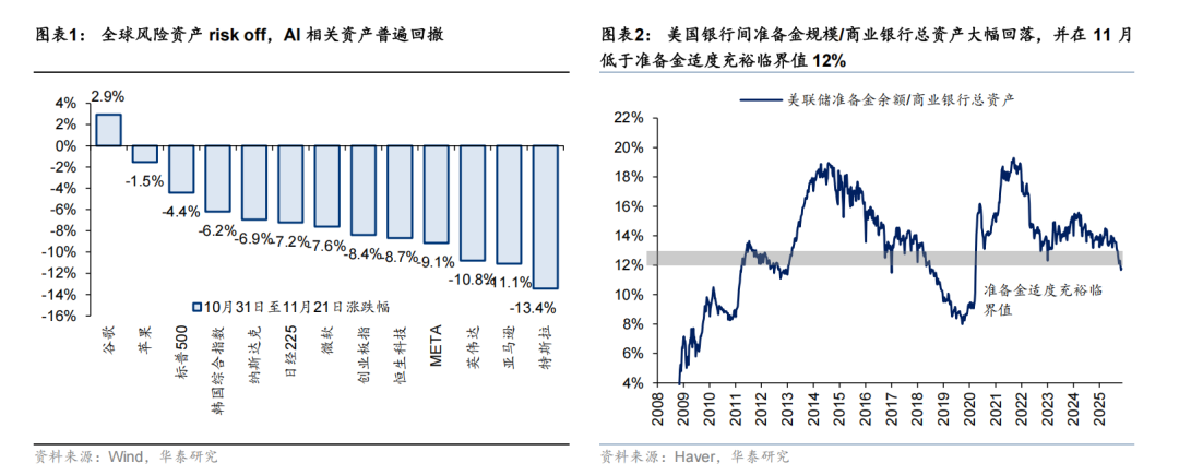 流动性环境近期边际收紧。1)年底成交活跃度下降。A 股近期日成交额回落至 2 万亿元以下,较 Q3 中枢显著回落,换手率也从 Q3 约 5%中枢回落至当前约 4%,单周港股换手率回落至 9%(近一个季度平均 10.8%),美股成交额同样出现萎缩。2)南向资金流入动能趋缓。10 月以来南向资金日均净流入从 9 月的 84.1 亿降至 57.5 亿港币附近。国内机构港股仓位普遍较高(3Q 国内主动偏股公募基金港股仓位在 28.2%的历史高位附近)、浮盈较多是主要原因,也有季节性因素。历史上看 12 月南向平均净流入相较于 9 月缩窄约 25%。3)美元流动性压制海外资产表现,也产生传导效果。从量上看,美国银行间准备金规模/商业银行总资产大幅回落,并在 11 月低于准备金适度充裕临界值 12%。从价上看,12 月 FOMC 降息概率从 10 月中旬的接近 100%降至当前仅 30%。4)供给压力增加。年底港股解禁金额提升较快,12 月港股潜在解禁金额约 1200 亿港币,对比来看,9、10、11 月解禁金额约 121 亿、624 亿、701 亿。