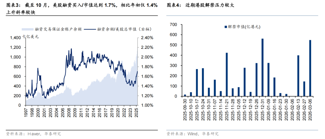 叠加前期市场杠杆仓位普遍较高,上述扰动也可能触发技术性回调。1)截至 11 月 20 日,A 股融资余额达 2.43 万亿元,仍处于年内较高水平。2)港股 11 月最新看沽、看购期权持仓较 10 月同期均提升约 15%。3)截至 10 月,美股融资余额/市值达到 1.7%,相比年初 1.4%上升较快。