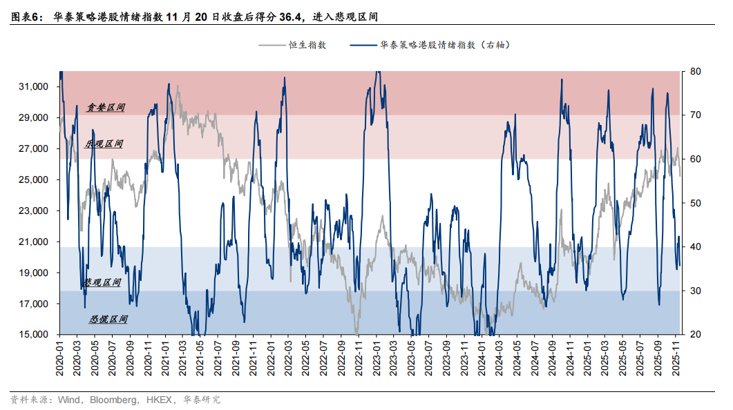 2) 截至昨日收盘,港股情绪指标为 36.4,仍在悲观区间。今日数据尚无法更新,但考虑到今日市场回调且南向流出,指标或继续下行。从该指标指示的操作信号看,指标进入悲观区间意味着上下行风险已经较为平衡,回落至 30 以下会正式触发买入信号。因此港股正在进入布局区,左侧投资者可以逐步建仓。对胜率要求更高或偏右侧的资金,可等待下周阿里、美团等港股核心企业发布财报以及密集解禁期结束。回溯来看,该指标上次触发信号为 10 月 2日,向上突破 70 进入贪婪区间,触发卖出信号,我们也成功提示投资者情绪过热,假期结束后波动率可能上升。