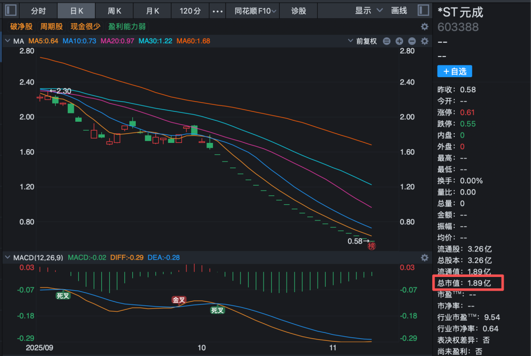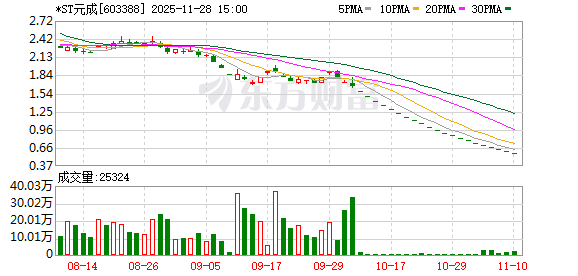 自10月13日起,*ST元成连续21个交易日“一”字跌停。截至11月10日收盘,公司股价仅为0.58元/股,市值约为1.89亿元。该股自11月11日开市起停牌至今。