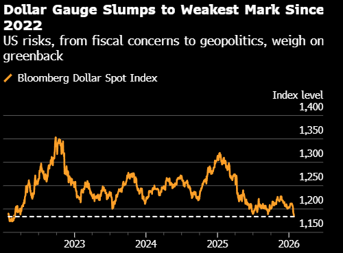 彭博一项衡量美元的指数跌至近四年来最低水平,日元反弹以及政府可能停摆带来的不确定性令美元承压。美元整体走弱推动欧元和英镑升至2021年以来的最强水平。